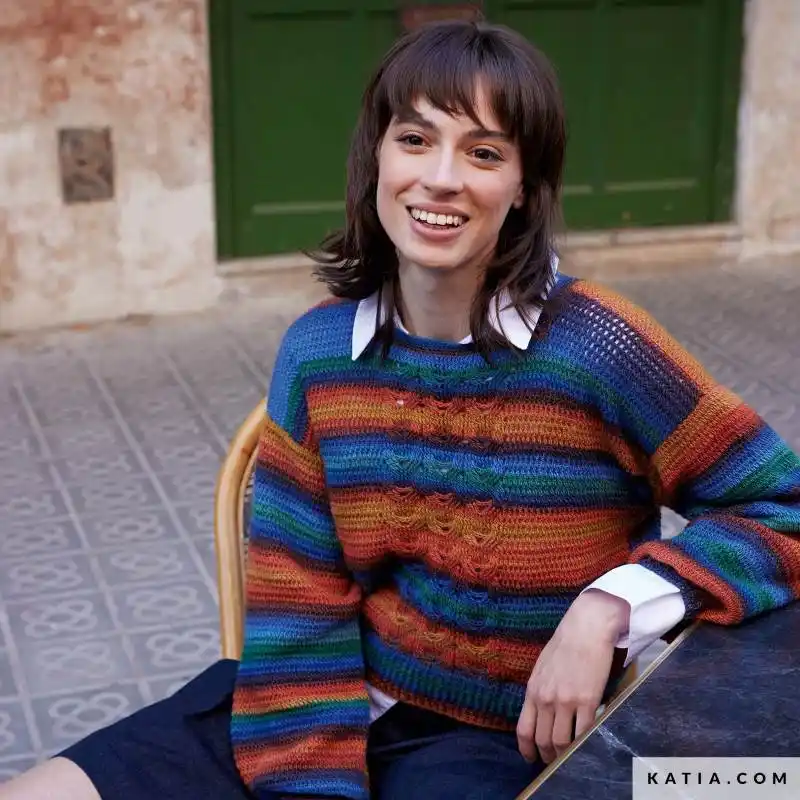 Su textura suave, ligera y su efecto degradado multicolor la hacen perfecta para chales, bufandas y prendas de punto fino.